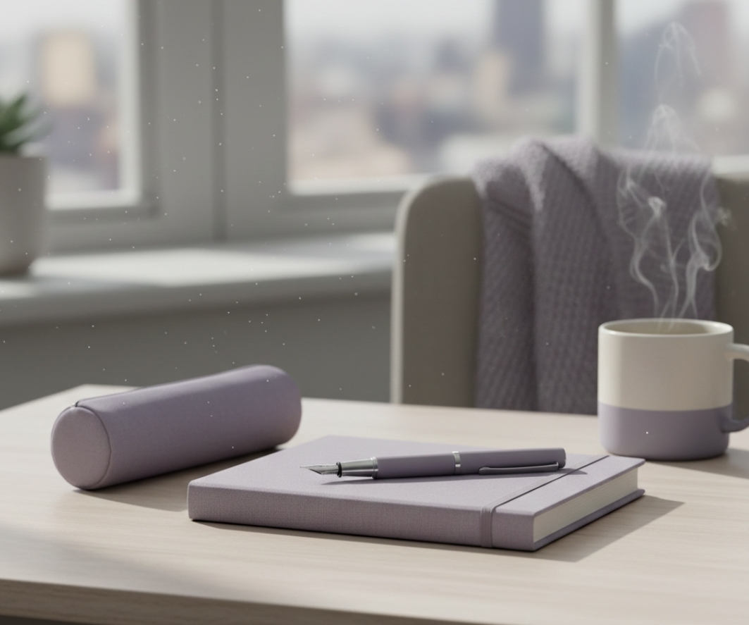 라벤더 그레이 톤의 니트나 머플러, 노트 표지, 필통이나 소형 소품을 활용하면 좋습니다. 눈에 자주 들어오는 곳에 이 색을 두면 마음이 안정되고, 조용한 결심이 흐트러지지 않도록 도와줍니다.